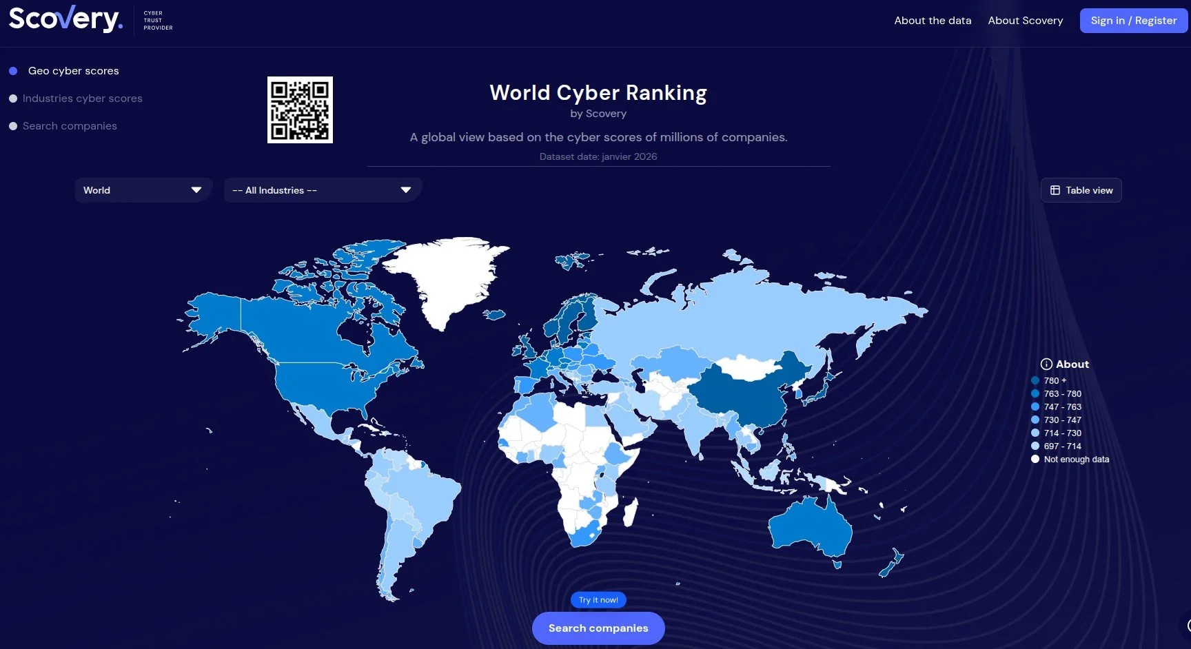 Sur ce site, en consolidant 4 millions d'entreprise aujourd'hui, nous présentons une carte du monde avec les postures des pays. Nous consolidons ces postures sous forme de zone géographique, de pays par zone géographique, et sous forme de secteur d'activité. Et nous permettons à chacun de venir trouver son entreprise et son cyberscore. Nous faisons aussi des observatoires sur des thématiques.